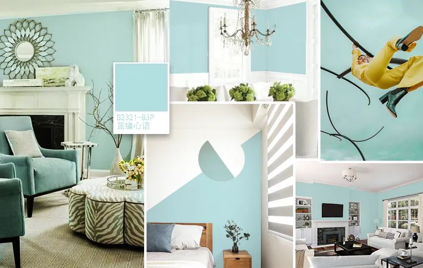 相近色也叫類似色,是運用標準色環上任何部分的45°-60°內的色。EX:黃-黃綠-綠;紅-紅橙-橙..等,均為相近色。藍綠色系不論用在何處,皆能適度提升溫柔與優雅,大寶設彩家刻意挑選純度調節到中等程度的B5640-73P揚帆遠航,是一淡化過后的藍色,飽和度低、明度高,搭配起來能帶給人寧靜平和的感受。當然選色處理得當,色感也更加豐富,相似色組合搭配能表達在維持原有風格的同時,讓空間視覺更有層次感。