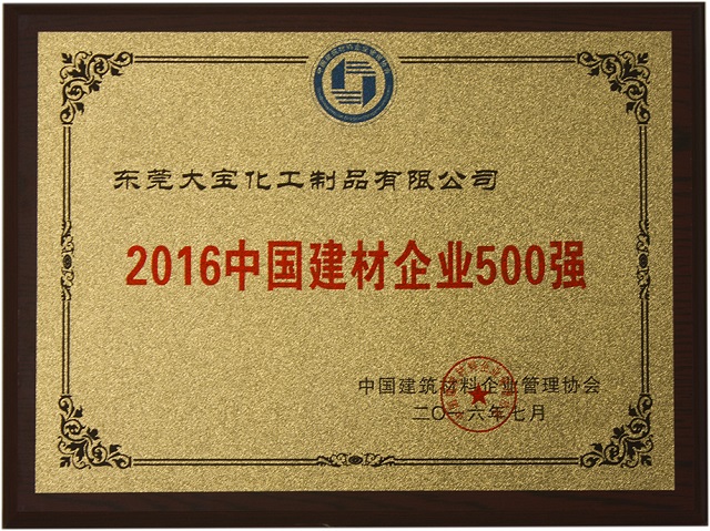 東莞大寶化工制品有限公司在中國建筑企業管理協會、中央國情調查委員會及焦點中國網的聯合評測中,榮獲“2016年中國建筑企業500強”榮譽獎項。