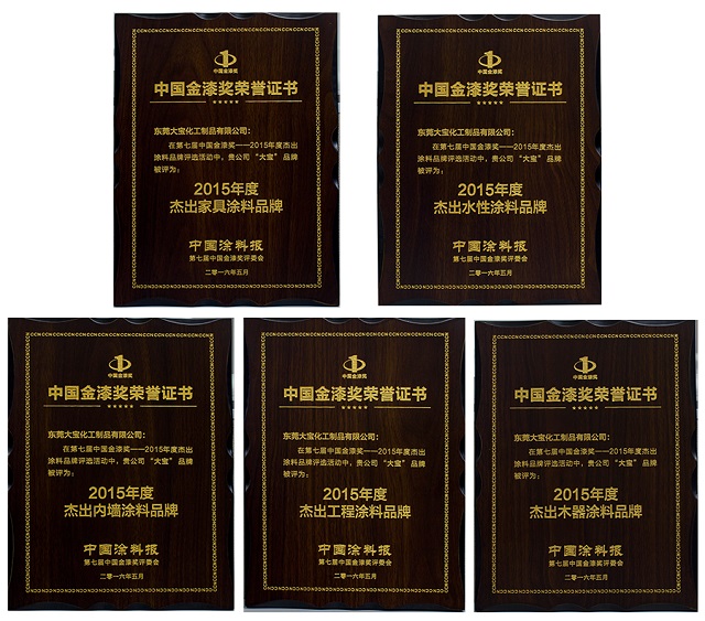 大寶漆憑借著過硬的產品質量及強大的銷售業績,獲得了廣大消費者的認可,一舉獲得了“2015年度內墻涂料杰出品牌”、“2015年度木器涂料杰出品牌”、“2015年度工程涂料杰出品牌”、“2015年度家具涂料杰出品牌”、“2015年度水性涂料杰出品牌”等五項大獎;