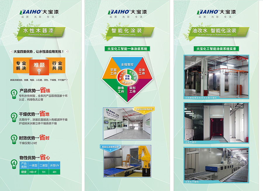 大寶漆經(jīng)過多年的技術(shù)專研,打造出了水性內(nèi)外墻面漆、水性木器漆等綠色環(huán)保產(chǎn)品,并推出水性木器涂料整體解決方案,針對(duì)家居行業(yè)面對(duì)水性漆干燥難題,斥巨資率先打造中國(guó)涂料行業(yè)首條大規(guī)模的智能化水性涂裝測(cè)試線,以便滿足客戶的立體工件、平面工件、異型工件等涂裝與干燥的多元化需求,一舉攻破行業(yè)油改水涂裝和干燥的重重難關(guān),領(lǐng)先行業(yè)實(shí)現(xiàn)了家具廠環(huán)保自動(dòng)化涂裝的可能性,為家具企業(yè)油改水的跨越做出了貢獻(xiàn)。