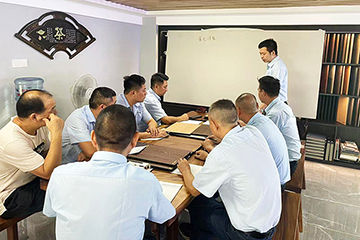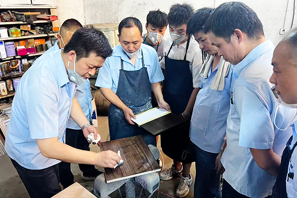 理論課程后,趙副理帶領大家投入色板制作實戰。從白胚檢查、砂光處理,到底色施工、底漆噴涂、修色及面漆完工,每一個環節都結合產品特性與配比要求進行實操演練,幫助大家真正掌握完整工藝流程,提升在實際服務中的應對能力。