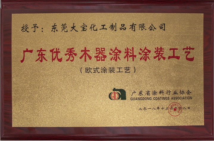 在2018廣東環(huán)保涂裝發(fā)展大會上,舉行了廣東省涂料行業(yè)協(xié)會“涂裝分會”成立儀式、2018廣東優(yōu)秀涂料涂裝項目表彰活動。憑借在綠色涂裝領域的優(yōu)勢和良好口碑,大寶漆被授予廣東省涂料行業(yè)協(xié)會涂裝分會“副理事長單位”。 在大會頒獎環(huán)節(jié),大寶漆歐式涂裝工藝還獲得“廣東省優(yōu)秀木器涂料涂裝工藝”榮譽。