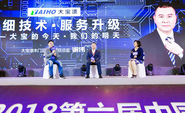 在“木門黑科技”高端對(duì)話環(huán)節(jié)中,謝總監(jiān)與搜門網(wǎng)CEO石興、東威利總經(jīng)理葉廣柱共同探討大寶漆在木門品質(zhì)提升上的作用。