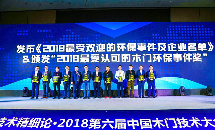 大寶漆榮獲2018最受認(rèn)可的木門環(huán)保事件獎(jiǎng)(左四謝偉代表領(lǐng)獎(jiǎng))