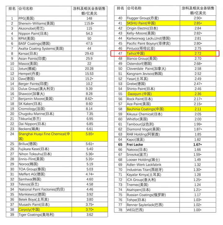 日前,美國Coatings World雜志(July 2018)最新發(fā)布2018年全球頂級涂料制造企業(yè)銷售額排行榜(前78名)(2018 Top Companies),中國6家涂料企業(yè)殺入重圍,比上年增加1家。作為中國著名涂料品牌,大寶漆連續(xù)多年登上該排行榜,此次在榜單中位列第47名,較上年提升8名。