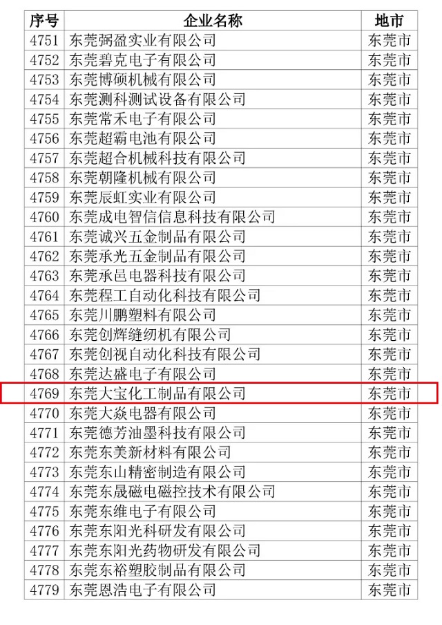 12月11日,公示的廣東省2017年第二批擬認定國家高新技術企業名單,東莞大寶化工再次通過“高新技術企業”認定,是繼2011年被認定為高新技術企業后第三次通過認定。它不僅標志著大寶化工的研發創新工作邁上新的臺階,也表明大寶化工的自主研發能力和創新能力均在涂料行業中處于前列!