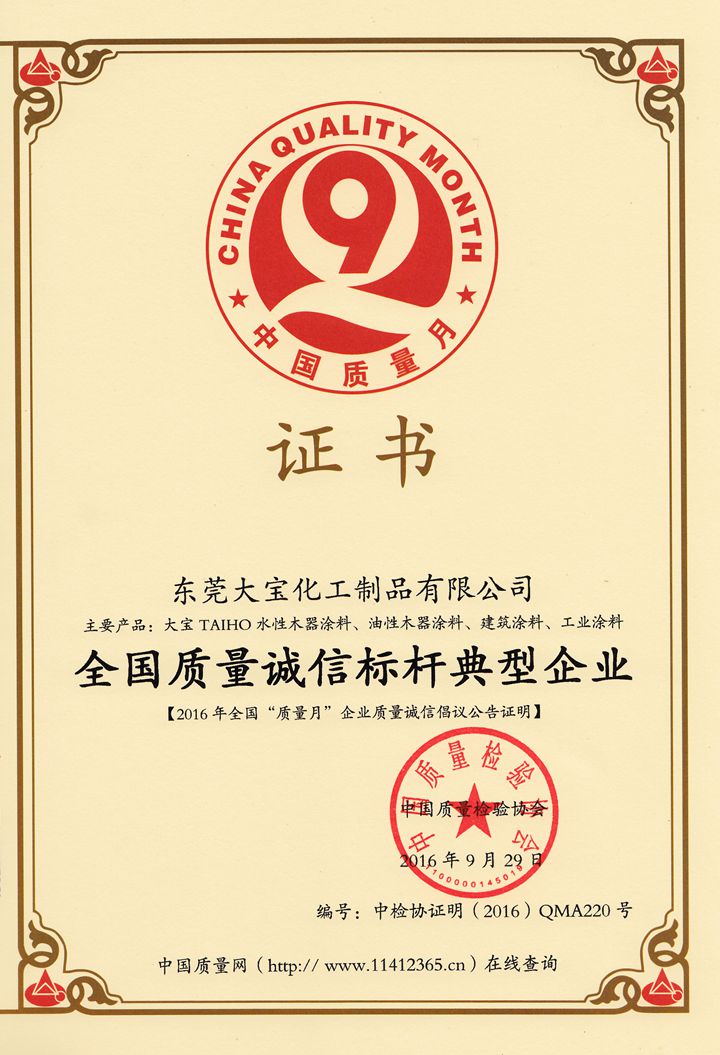 為推進建設(shè)質(zhì)量強國,按照國務(wù)院辦公廳印發(fā)《貫徹實施質(zhì)量發(fā)展綱要2016年行動計劃》的要求,并具體部署:中國質(zhì)量檢驗協(xié)會繼續(xù)組織開展“企業(yè)質(zhì)量誠信倡議”專題活動,助力“中國制造”品牌提升。中國質(zhì)量檢驗協(xié)會組織開展的“企業(yè)質(zhì)量誠信倡議”專題活動,對供給側(cè)改革、提升“中國制造”的品牌形象具有重要的意義,“全國質(zhì)量誠信標(biāo)桿典型企業(yè)”的授予,意味著大寶漆在企業(yè)誠信、產(chǎn)品質(zhì)量上做的努力獲得了廣大消費者的認(rèn)可!
