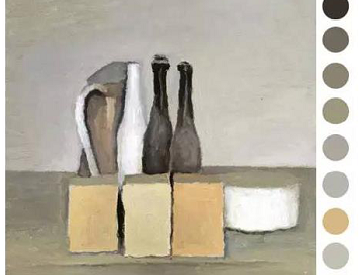 莫蘭迪色系源于意大利畫家喬治·莫蘭迪(作品見右圖),中國宋代以前的瓷器、繪畫作品也有很多相似色彩。莫蘭迪色具有低明度,低飽和度的特點,摒棄了張揚的色彩,融入適度灰色和白色作為調和,將原本濃郁艷麗的色彩轉化為優雅高級的灰色質感。莫蘭迪色因為《延禧宮略》電視劇,成為一股勢不可擋的潮流,這系列色彩簡單說就是蒙著一層灰的低明度中性色調,卻擁有久看不膩的質感。